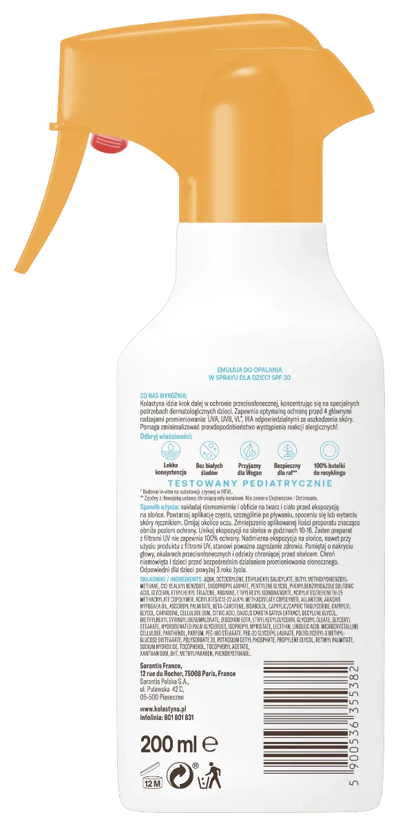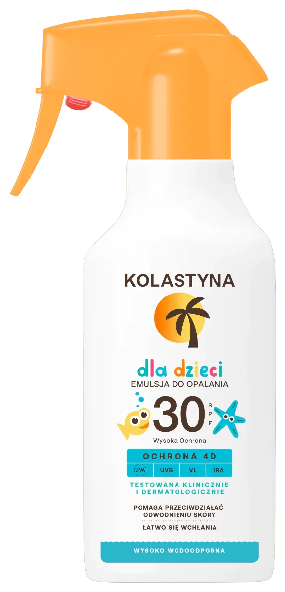 Emulsja do opalania dla dzieci w sprayu SPF 30 KOLASTYNA została stworzona dla delikatnej skóry dziecka. Oferuje skuteczną i fotostabilną ochronę przed 4 głównymi rodzajami promieniowania (UVA, UVB, światło widzialne, promieniowanie podczerwone), które przyczyniają się do poparzenia słonecznego oraz powstawania wolnych rodników odpowiedzialnych za przedwczesne starzenie oraz fotostarzenie skóry. Zawarty w formule beta-glukan oraz prowitamina D wspomagają stymulowanie układu odpornościowego skóry dziecka dla wzmocnionej obrony przed negatywnymi czynnikami zewnętrznymi, pomagają ograniczyć powstawanie stanów zapalnych i zaczerwienienia skóry, przyczyniają się do utrzymania nawilżenia.