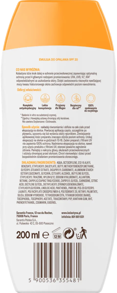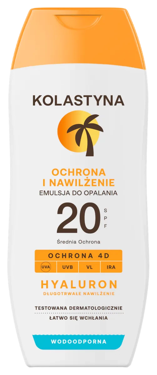 Emulsja do opalania SPF 20 KOLASTYNA oferuje skuteczną i fotostabilną ochronę przed 4 głównymi rodzajami promieniowania (UVA, UVB, światło widzialne, promieniowanie podczerwone), które przyczyniają się do poparzenia słonecznego oraz powstawania wolnych rodników odpowiedzialnych za przedwczesne starzenie oraz fotostarzenie skóry. Zawarte w formule karotenoidy, naturalne i silne antyoksydanty, pomagają pobudzić własny system obronny skóry, zapewniają pielęgnację i ochronę przed fotostarzeniem oraz zdrowy, młodzieńczy wygląd.